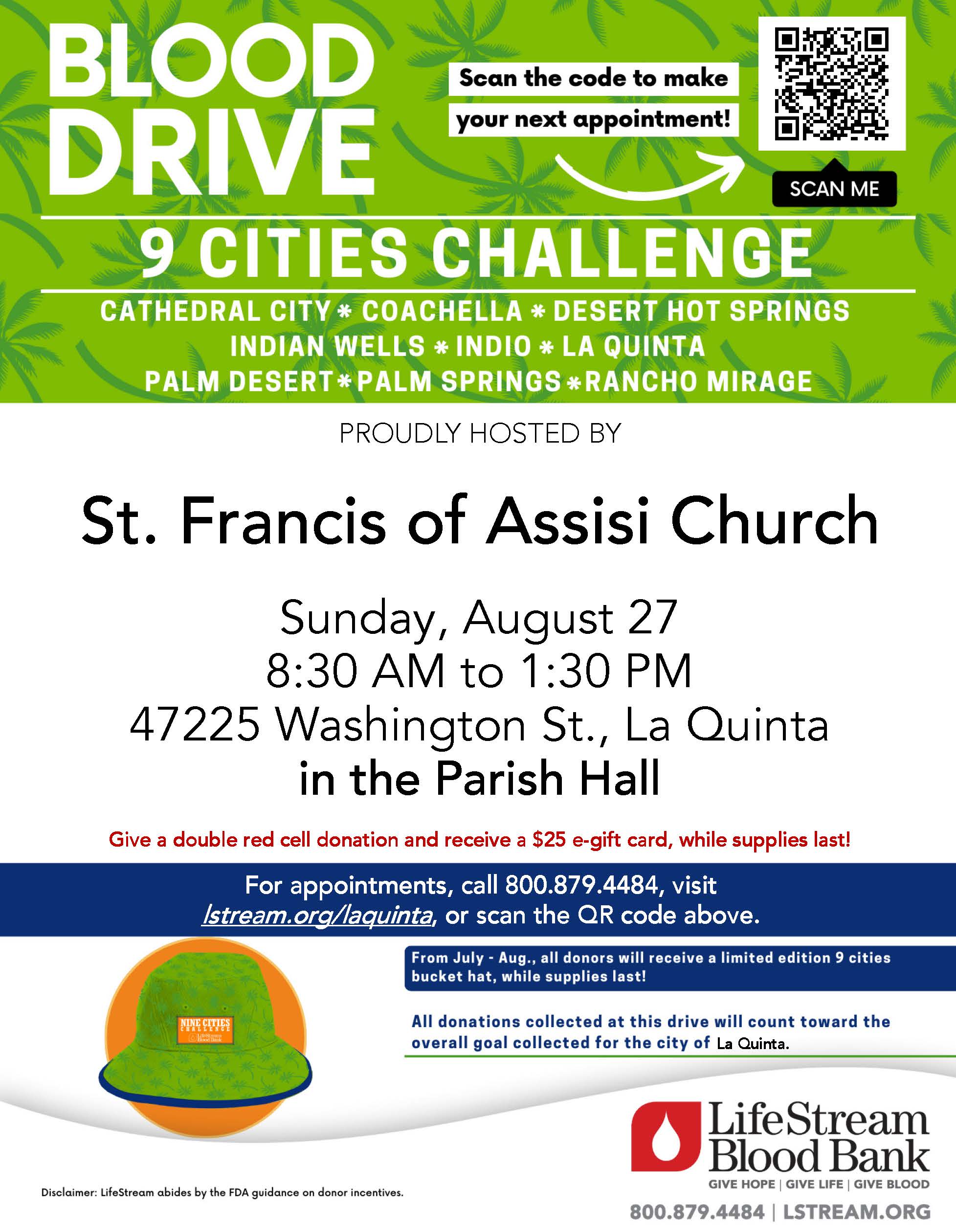 St. Francis of Assisi Church is hosting a blood drive on Sunday, August 27, from 8:30 a.m. to 1:30 p.m. in the Parish Hall (47225 Washington St) as part of the 9 Cities Challenge.