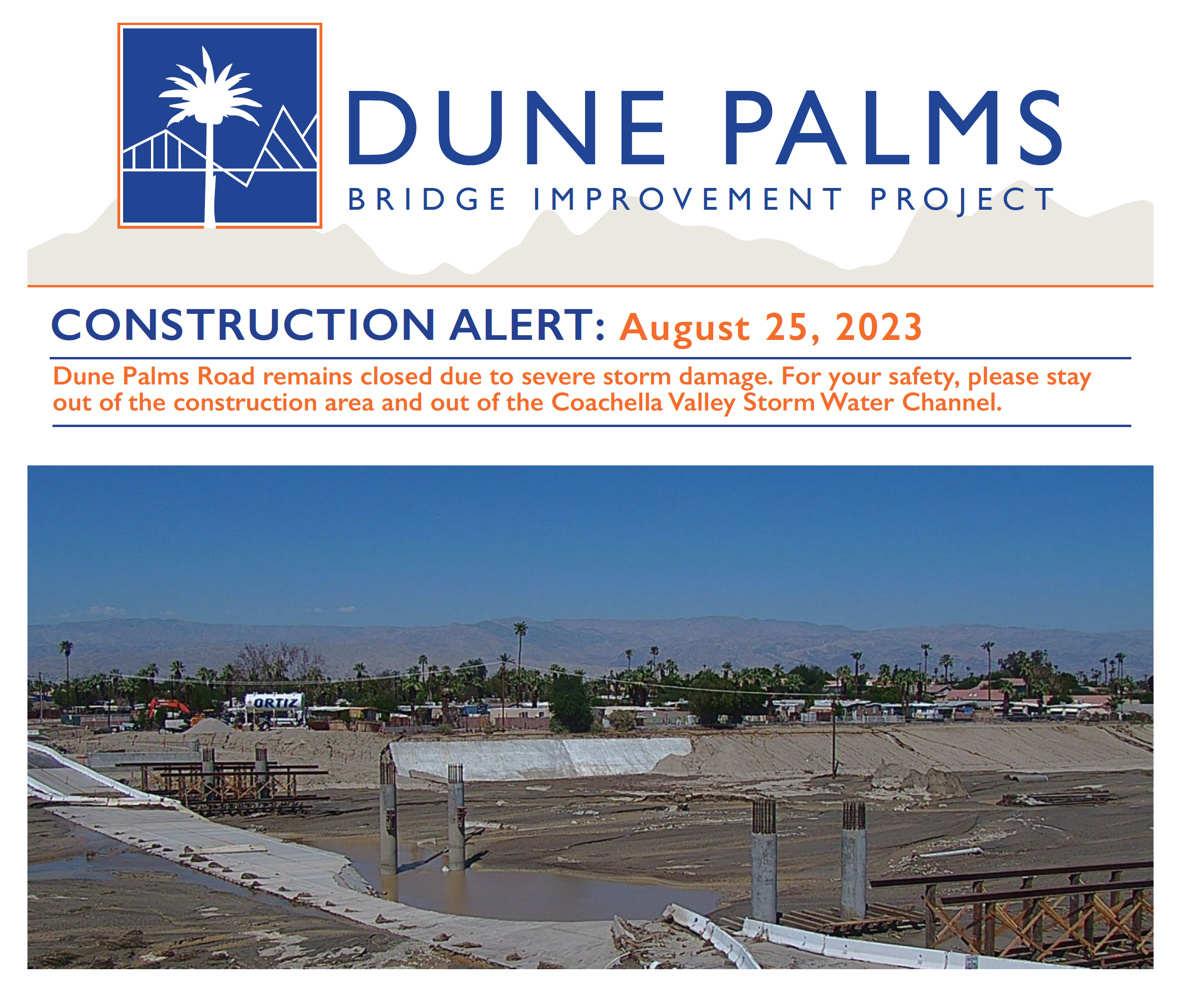 Dune Palms Road is CLOSED from north of Corporate Centre Dr to south of Dune Palms Mobile Home Estates due to severe storm damage. Contractors will resume work on the bridge structure, roadway and waterline construction once it is safe to continue. For your safety, please stay out of the construction area and Storm Water Channel.