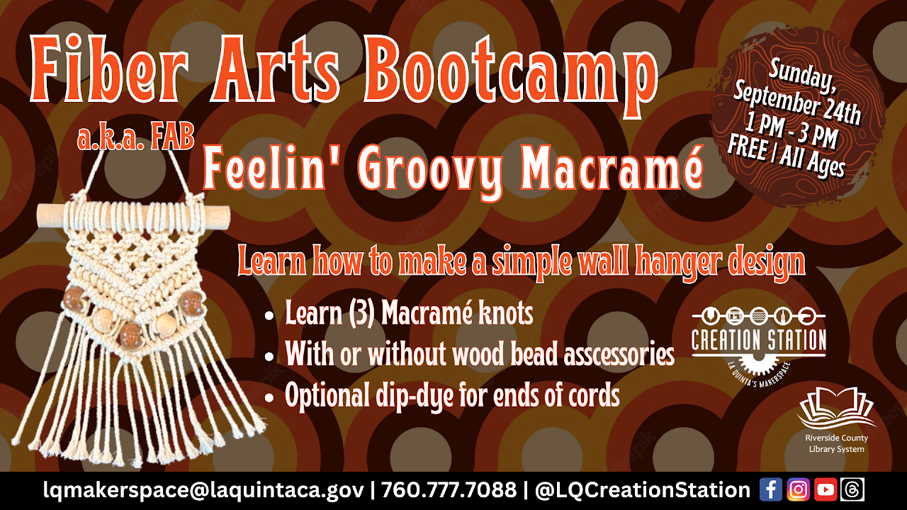 Fiber Arts Bootcamp: Feelin’ Groovy Macrame Join us Sunday, September 24, at 1:00 P.M to 3:00 P.M. All ages (6+). This month members of FAB we will travel back in time to the late 60's and 70's and learn to make a simple GROOVY Macramé design. You’ll learn how to make a Larks Head Knot, a Square Knot and a diagonal Double Half Hitch Knot together small wall hanging work of art. This program is recommended for ages 6 and older. All materials for the project will be provided while supplies last.