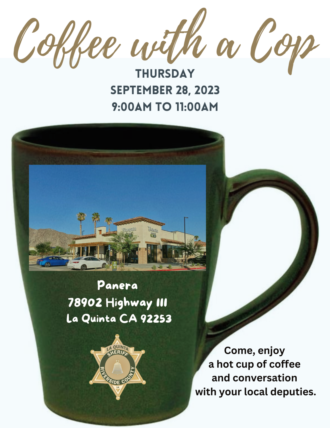 Come enjoy a hot cup of coffee with your local Riverside County Sheriff's Deputies on Thursday, September 28, 2023, from 9 to 11 a.m. The location is the new Panera Bread at 78902 Highway 111 in La Quinta.