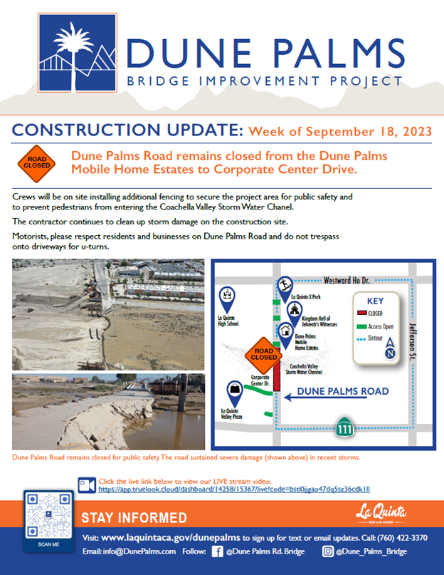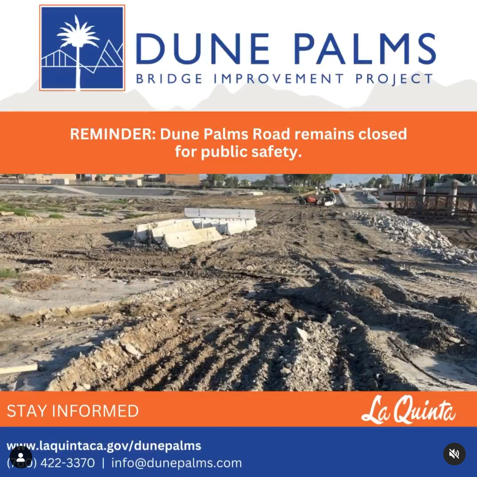 Dune Palms Road is severely washed out from storm damage and unsafe for vehicles and pedestrians to use. The road remains closed until further notice. Please use Jefferson St and Adams St for access. Please stay out of the channel for your safety.