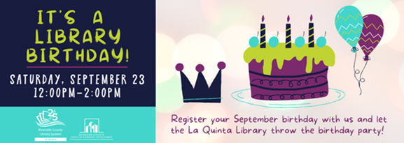 It’s a Library Birthday! All ages welcome on Saturday, September 23, at 12:00 P.M. Register your September birthday and let the library throw the birthday party! Our once-a-month library birthday party will include games, crafts and stories geared to create a safe, fun, all-inclusive birthday experience. Members of the community are encouraged to come and celebrate September birthdays with us! Sponsored by Friends of the La Quinta Library. *Registration required*