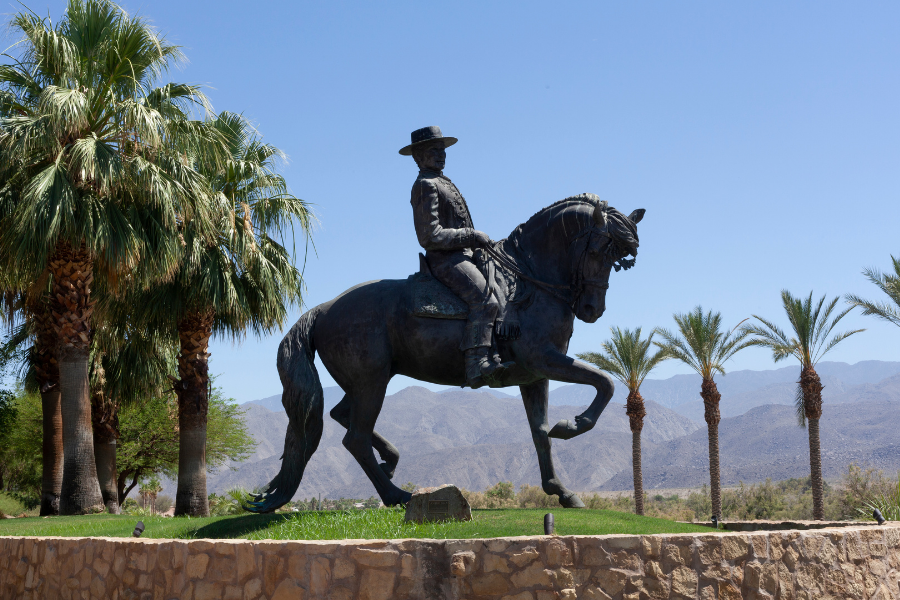The sculpture stands 14 feet tall and weighs more than 3,000 pounds. It is the largest bronze sculpture in the City of La Quinta. Tall, strong, elegant, and noble are qualities that describe an excellent Andalusian stallion. They are also qualities that describe the artistic bronze work of sculptor Patricia Borum who was commissioned by the luxury golf community of Andalusia at Coral Mountain to create a bronze likeness of its logo, the Andalusian stallion and rider. The sculpture is part of Andalusia at Coral Mountain's contribution to the City of La Quinta's Art in Public Places program and the total cost of the piece was approximately $180,000.