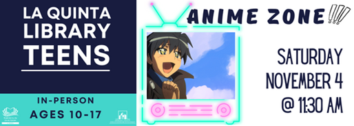 Saturday, November 4 at 11:30 A.M. Ages 10-17. Enjoy random anime with friends. Commentary encouraged!