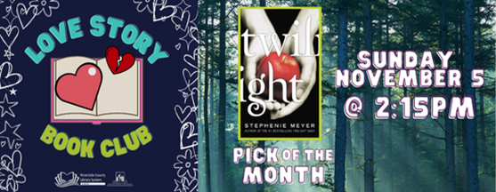 Love Story Book Club. Ages 18+. Sunday, November 5, at 2:15 P.M. Happily Ever After not guaranteed in this traditional book club featuring romantic titles. October’s pick: Twilight by Stephanie Meyer. See the Adult Reference Desk to register and to ask about available copies. *Registration required*