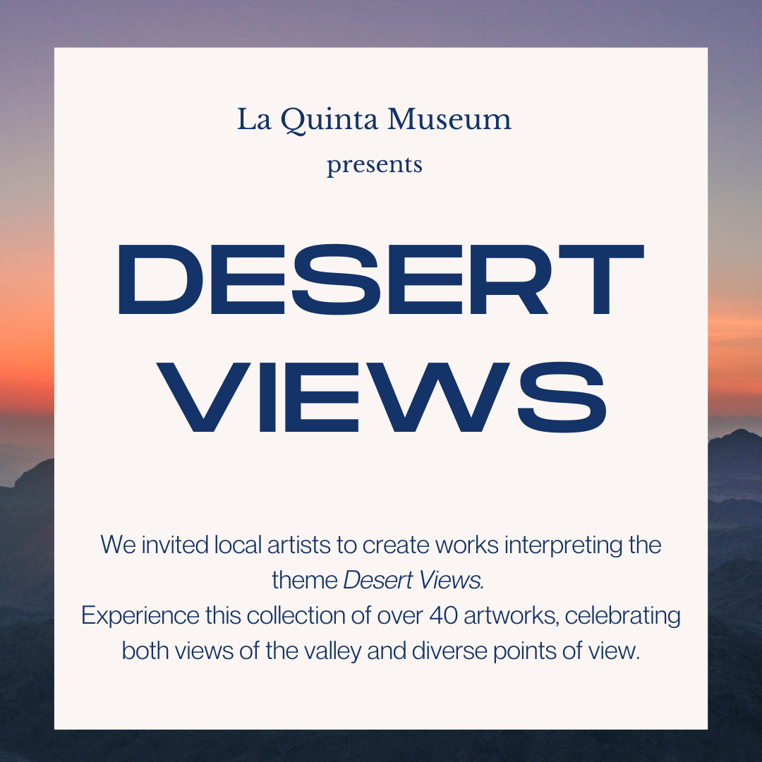 Desert Views. On exhibit through January 27, 2024. Enjoy work from local artists interpreting the theme “Desert Views”. Experience this collection of over 40 artworks, celebrating both views of the valley and diverse points of view.