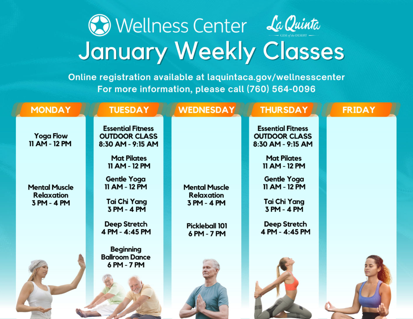 The La Quinta Wellness Center is offering fitness classes in January. Yoga Flow, Gentle Yoga, Mat Pilates, Tai Chi Yang, Essential Fitness, Mental Muscle Relaxation, Deep Stretch, and Beginning Ballroom Dance are available for online registration now! Please call the Wellness Center for more details (760) 564-0096.