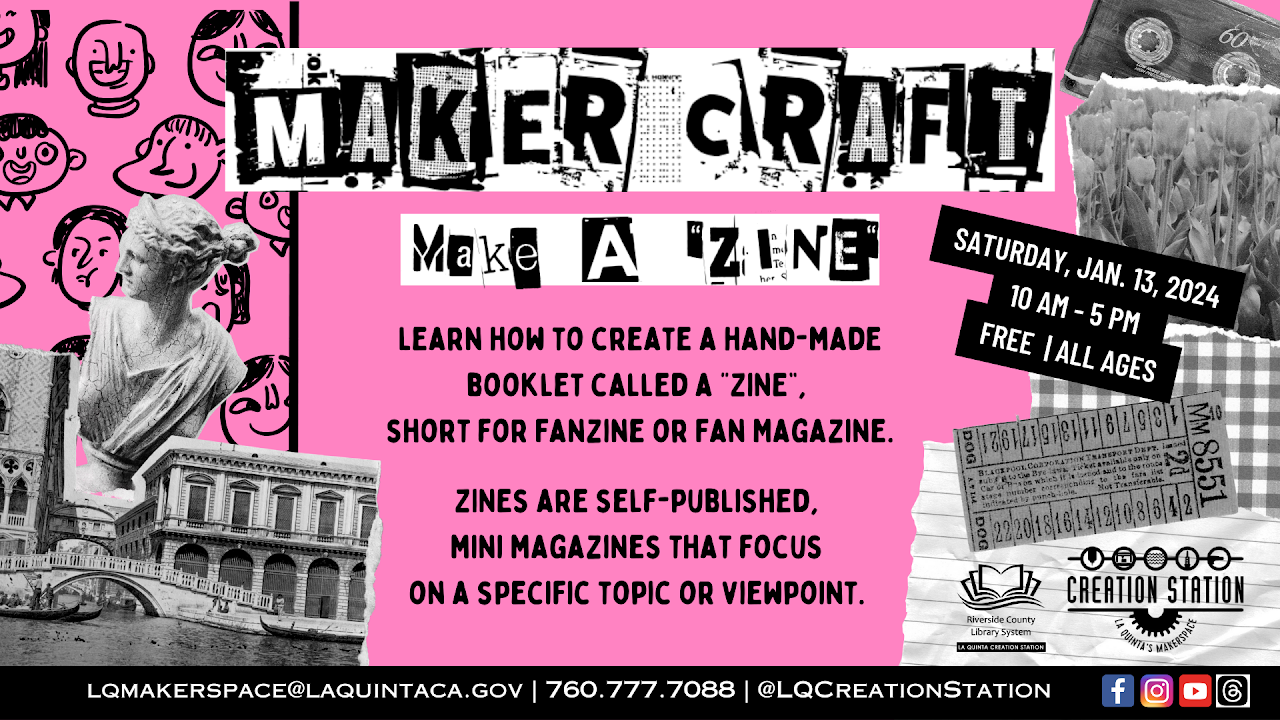 Maker Craft: Make A "ZINE" on Saturday, January 13, 2024, from 10:00 A.M. - 5:00 P.M. It's a New Year and time for a New Craft! Join the MakerSpace staff as we will teach patrons how to design and create a "ZINE." A "ZINE" is short for FANZINE or Fan Magazine that focuses on a fandom (ex. Book Series), specific topic (ex. Plants) or socio/political opinion.