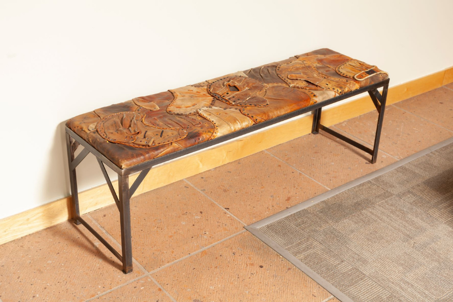 Based in Denver, Colorado, Dolan Geiman creates his modern mixed media artwork from a folk-art tradition infused with a contemporary western style. Working as a full-time artist since 2001 with his wife and business partner Ali Marie, Geiman has achieved nationwide recognition through art fairs, art gallery representation, and commission artwork for private and corporate clients. Past clients include New Balance, Pendleton, YouTube, and over 100 public collections across the country. League bench is constructed from reclaimed baseball gloves and was purchased at the 2018 La Quinta Art Celebration.