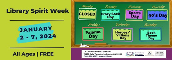 Join the Library staff for Spirit Week from Monday, January 2 to Sunday, January 7. Let's welcome the new year by joining our staff in dressing up for our spirit week of fun! Tuesday: Crazy Sock Day, Wednesday: Sports Day, Thursday: 90s, Friday: Pajama Day, Saturday: Heroes/Villains, Sunday: Book Theme Day.