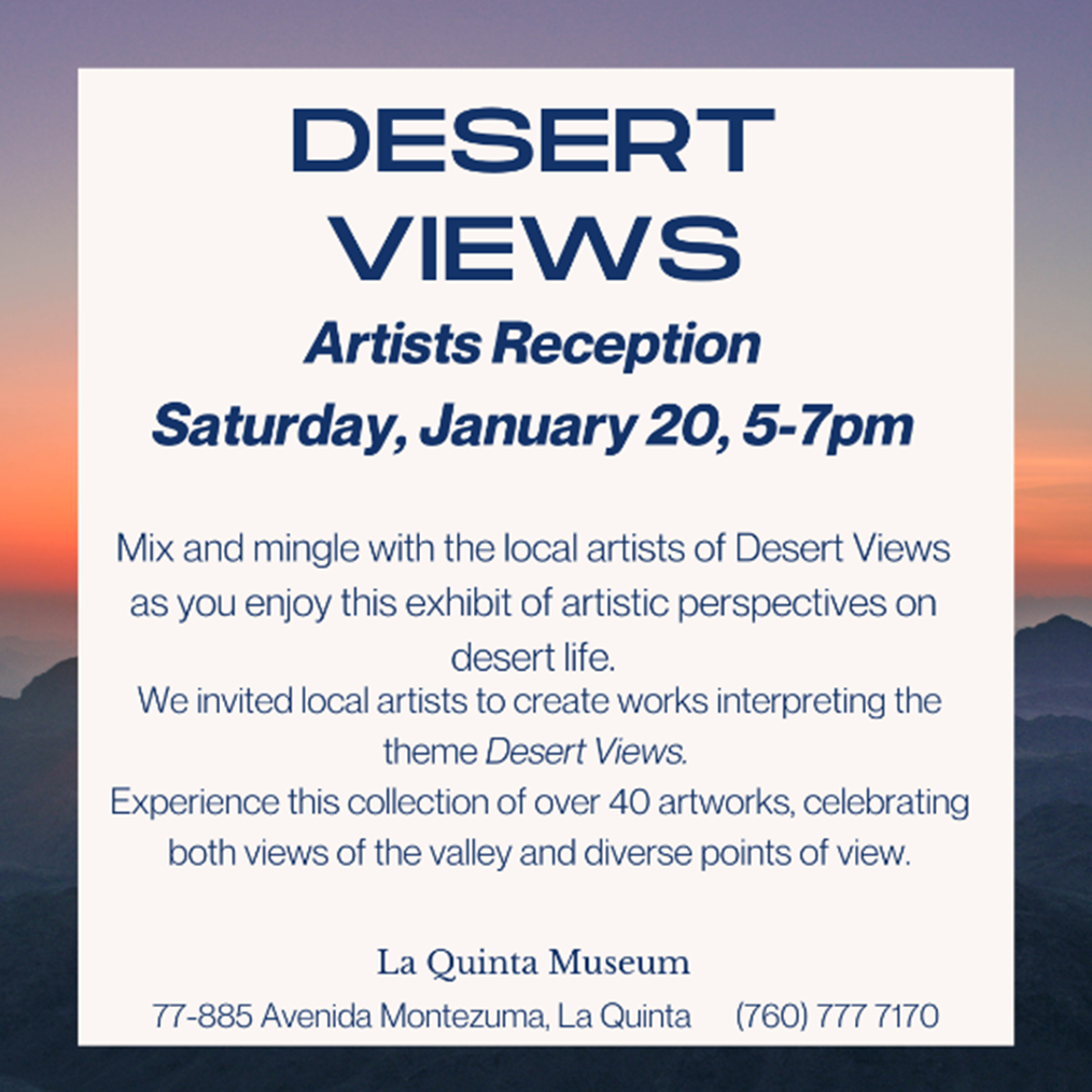 Desert Views Artists Reception will be held on Saturday, January 20, from 5:00 P.M. - 7:00 P.M. Mix and mingle with the local artists of Desert Views as you enjoy this exhibit of artistic perspectives on desert life.