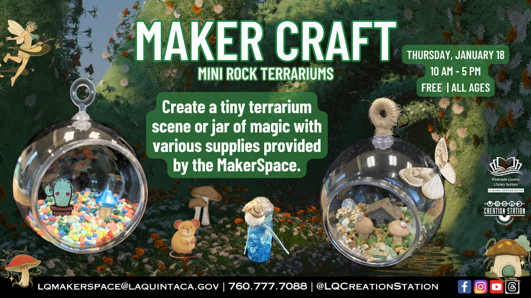 Maker Craft: Mini Rock Terrariums on Thursday, January 18, 2024, from 10:00 A.M. - 5:00 P.M. If you enjoy cottage core, fairytales or mini crafts, you'll love our Mini Rock Terrarium craft program. Patrons will have access to aquarium rock, deer moss, wooden mushrooms, 3D printed house and more supplies to create a small magic scene in a small plastic terrarium globe.