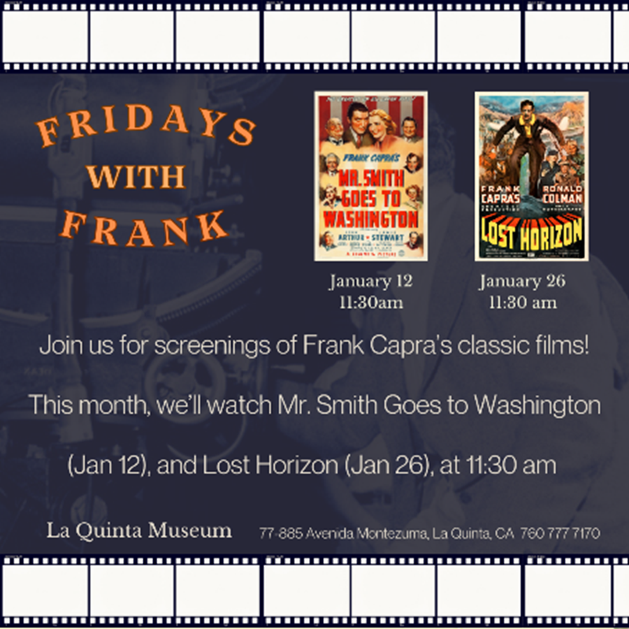 New mini exhibit in our Local History gallery: La Quinta Legends: Frank Capra. Legendary director Frank Capra’s films made the American dream come alive on the silver screen during the 1930s and 40s—and our own La Quinta may have played a part in his success! This exhibit shines the spotlight on the life of one of our city’s most celebrated residents.