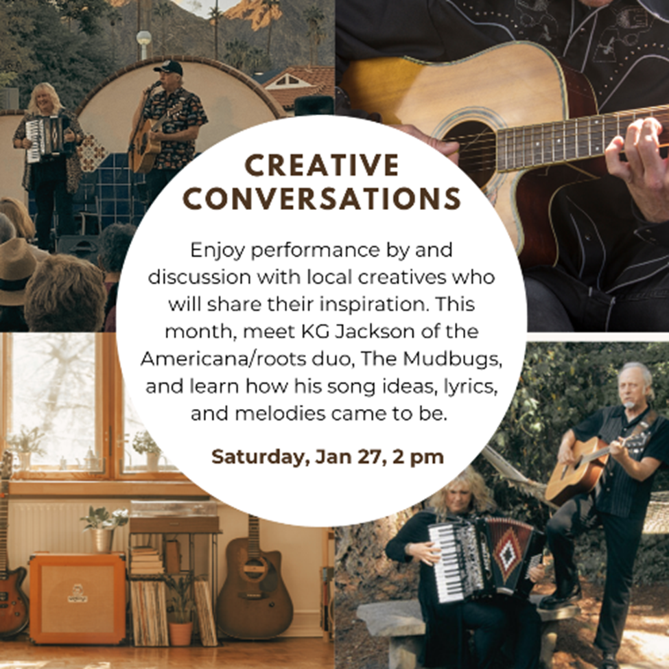 Creative Conversations: Join us Saturday, January 27, at 2:00 P.M. Enjoy a performance by and discussion with local creatives who will share their inspiration. This month, meet KG Jackson of the Americana/roots duo, The Mudbugs, and learn how his song ideas, lyrics, and melodies came to be.