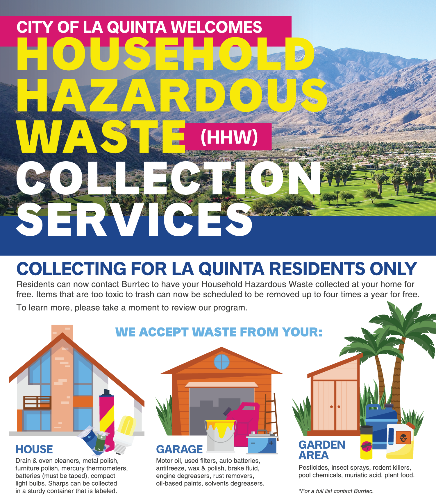 HHW collections will be made Monday - Friday during normal business hours of 8 a.m. to 5 p.m. Collections must be scheduled with Burrtec in advance of the pick-up date. Please call Burrtec at (760) 340-2113. Individual households are limited to four (4) HHW collection dates per calendar year. Please visit www.laquintaca.gov/Recycle for more information.