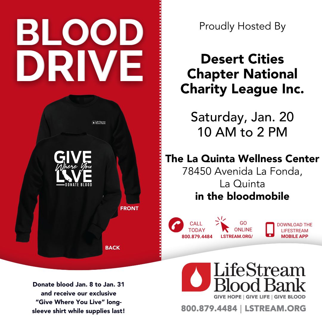Donate blood at the La Quinta Wellness Center on Saturday, January 20, from 10 a.m. - 2 p.m. The LifeStream Bloodmobile will be parked in the Wellness Center parking lot. Donors will receive the NEW "Give Where You Live" long-sleeve shirt while supplies last and a $20 gift card! For more information and to schedule an appointment, please visit giftoflife.lstream.org.