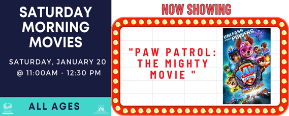 Saturday Morning Movies at the Library - Join us Saturday, January 20, at 11:00 A.M. for a movie showing of Paw Patrol: The Mighty Movie. We will have popcorn for a limited time. You’re welcome to bring your own snacks as well! All drinks must have a lid. Limited seating so registration is welcomed.