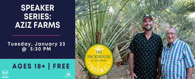 Speaker Series: Aziz Farms will take place Tuesday, January 23, at 5:30 P.M. In preparation for our Book Fest “An Ode to the Desert” come and listen to Aziz Farms, a local, family-owned date farm producing produce for local restaurants as well as Desert Sands Unified School District. Q&A session along with a small date tasting!
