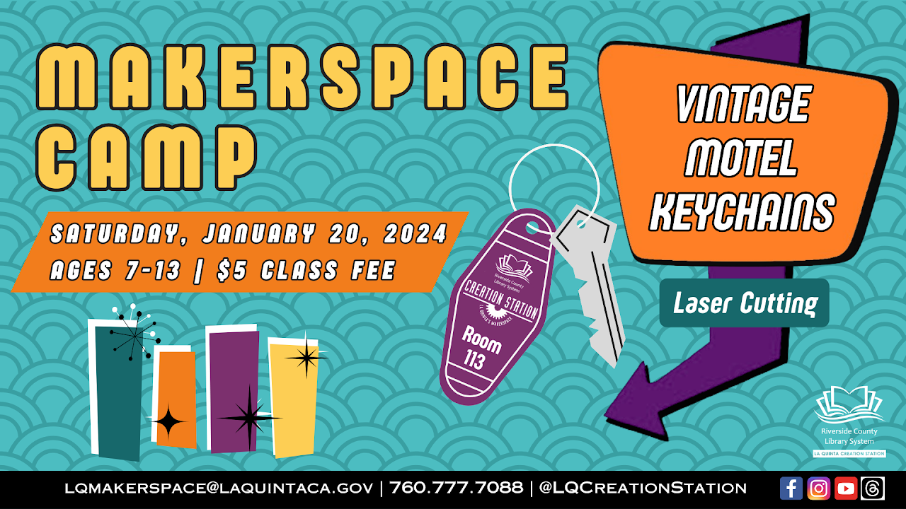 MakerSpace Camp: Laser Cut Vintage Motel Keychains. If you are a Maker between the ages of 7 and 13 and are interested on how to use a Laser Cutter, register for the 1st MaakerSpace camp of 2024. Saturday, January 20, $5 Camp Fee. Session A: 10:30 AM - 12:00 PM & Session B: 1:30 PM - 3:00 PM.