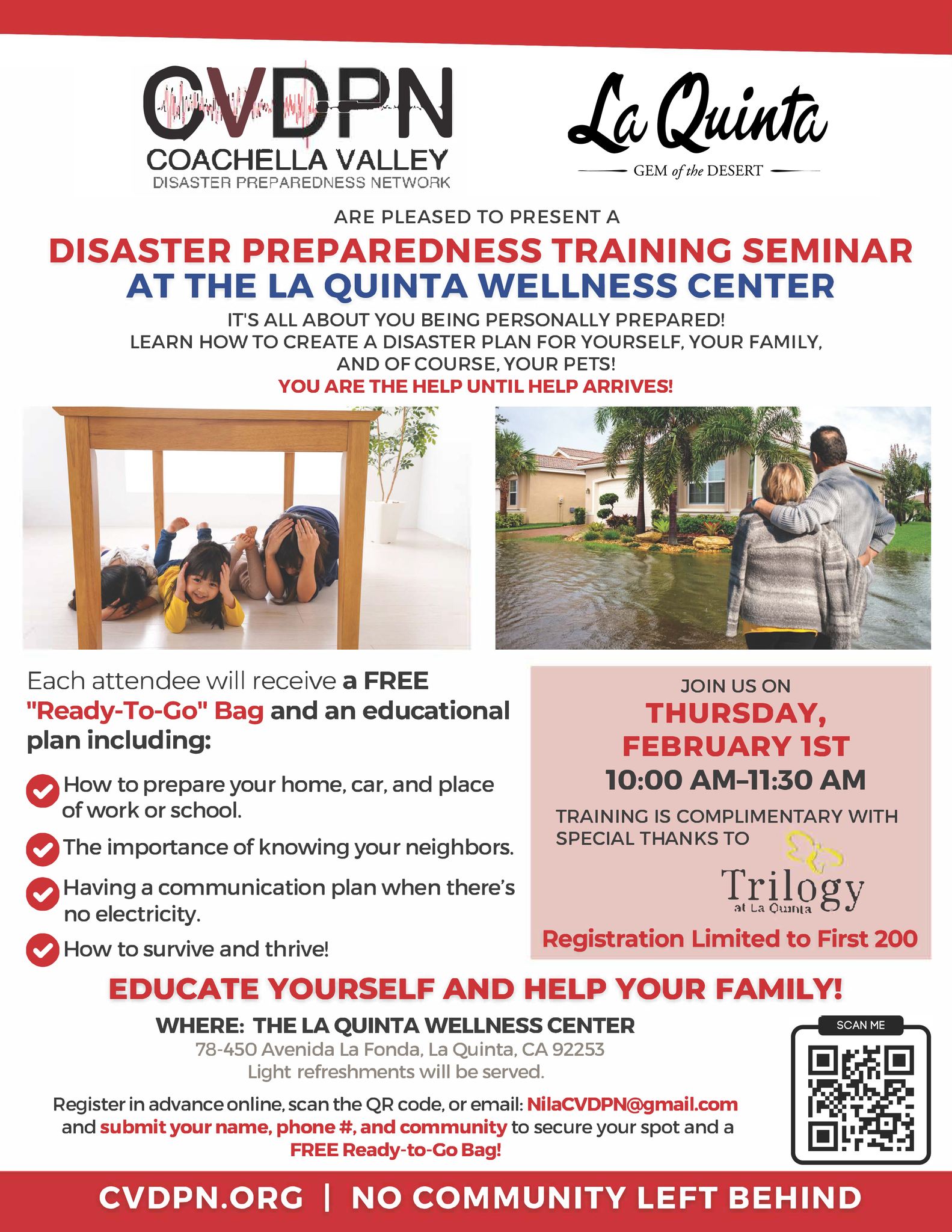 The Coachella Valley Disaster Preparedness Network (CVDPN) will be conducting a Disaster Preparedness training seminar at the La Quinta Wellness Center on Thursday, February 1, from 10:00 - 11:30 a.m. Each attendee will receive a free "Ready-to-Go" bag and an educational plan that includes information about: