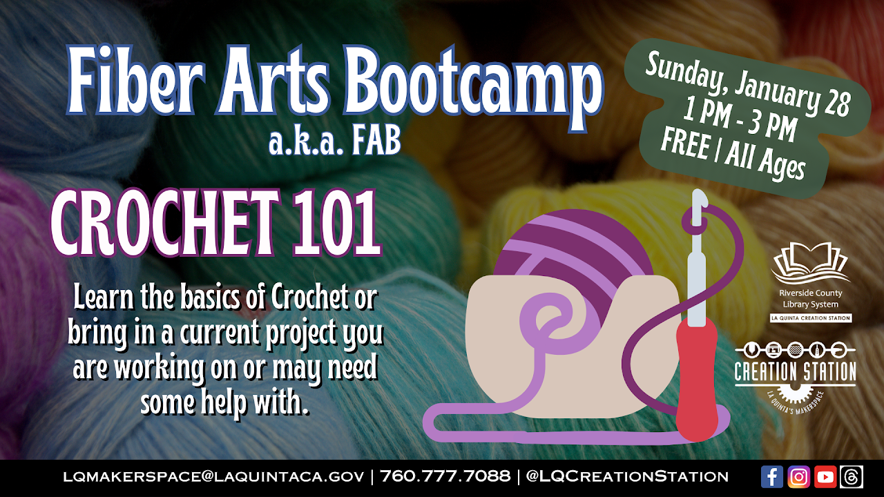 FAB: CROCHET 101 - Join us Sunday, January 28, from 1:00 PM - 3:00 P.M. For our first meet-up of the Fiber Arts Bootcamp for 2024, we will start the year off with CROCHET 101. If you are new to crochet, need some extra help, or just want to work on a project and chat with fellow patrons, join us for this program. FREE while supplies last.