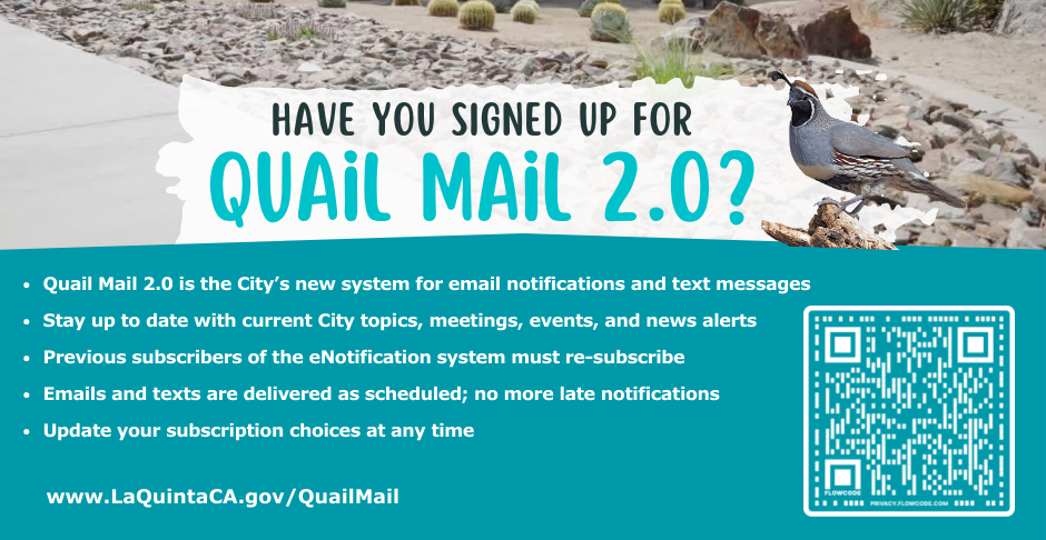 The City of La Quinta has an e-notification system (Quail Mail) that sends emails and text messages with the latest City news, events, alerts, meetings, and more! Subscribers can modify topic choices at any time. Click the image above or visit www.laquintaca.gov/QuailMail to sign-up or modify your preferences.