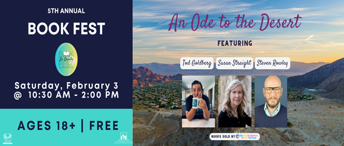Book Fest will be held Saturday, February 3, from 10:30 A.M. to 2:00 P.M. Join us for our 5th Annual La Quinta Book Fest at the La Quinta Public Library! This year's theme is "An Ode to the Desert" where we will celebrate the Coachella Valley in literature. There will be a short reading, a discussion panel & a book signing with our three guest authors: Tod Goldberg, Steven Rowley, and Susan Straight!