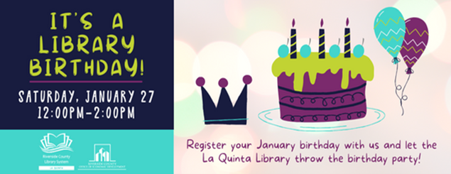It’s a Library Birthday! Join us Saturday, January 27, at 12:00 P.M. Register your January birthday and let the library throw the birthday party! Our once-a-month library birthday party will include games, crafts and stories geared to create a safe, fun, all-inclusive birthday experience. Members of the community are encouraged to come and celebrate December birthdays with us! Sponsored by Friends of the La Quinta Library. *Registration required*