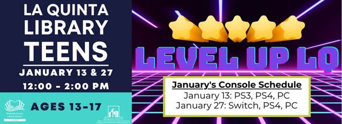 Level Up LQ calling all teen gamers! Join us to play a variety of games on different consoles including the PS4, Nintendo Switch & more. Join us Saturday, January 27, from 12:00 P.M. - 2:00 P.M.