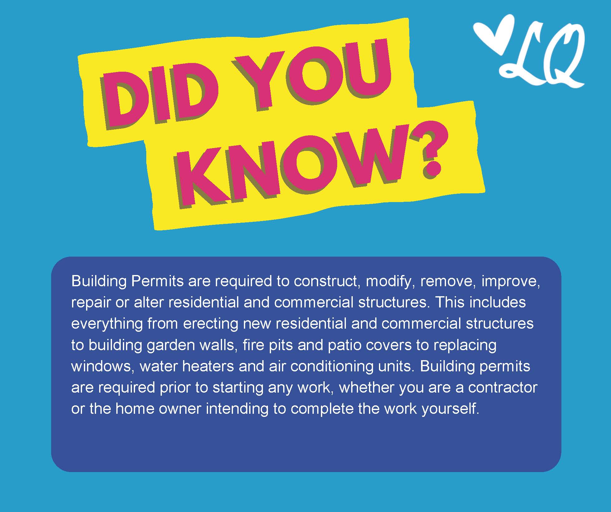 Permits include building construction, land use and special events, garage sales, public works encroachment, fire system installations and code compliance inspections.