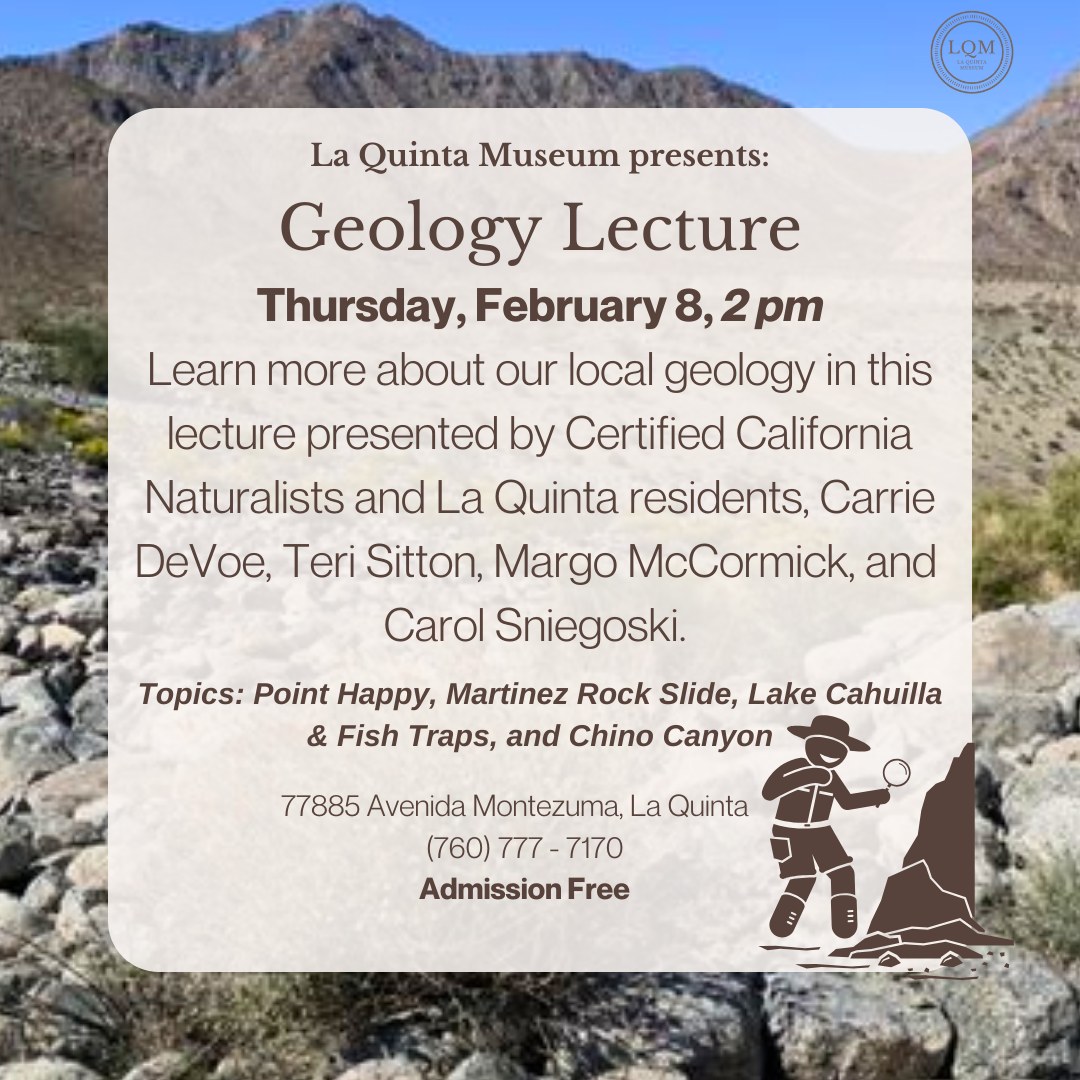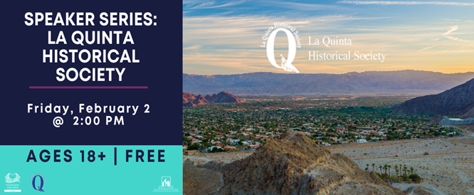 In preparation for LQ Book Fest: “An Ode to the Desert,” come join us for a presentation from the La Quinta Historical Society of ancient history of La Quinta through the 1982 incorporation of the city. Join us Friday, February 2, from 2:00 P.M. - 3:00 P.M.