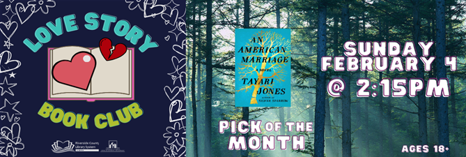 Join us Sunday, February 4, at 2:15 P.M. for the Love Story Book Club. A book club featuring romantic titles that may or may not have Happily Ever After’s. February’s pick: An American Marriage by Tayari Jones.