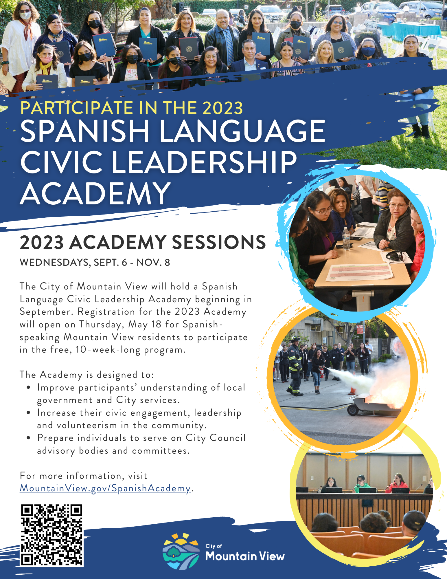 This program is open to all Mountain View Spanish-speaking residents interested in learning about city services, the budget process, volunteer opportunities, and ways to get involved in local decision-making. The Academy also prepares individuals to serve on City Council advisory bodies and committees.