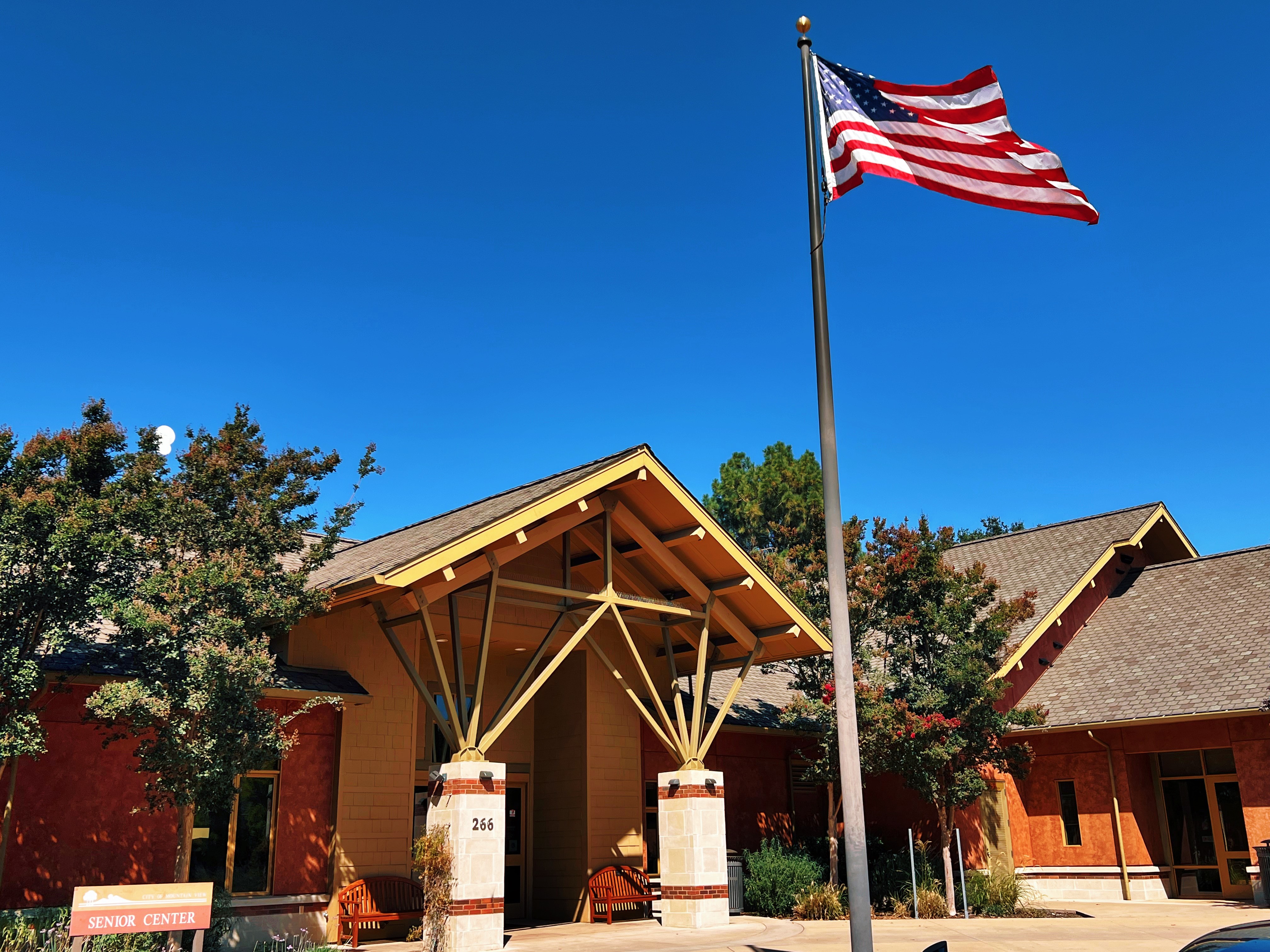 The Community Services Agency’s Senior Nutrition Program offers dine-in meals in the Social Hall of the Mountain View Senior Center. Doors open at 10:30 a.m., sign-in starts at 11 a.m., and lunch is served from 11:45 a.m. to 12:15 p.m. The Social Hall closes at 1 p.m. A $5 donation is suggested for permanent residents 60+ of Santa Clara County.