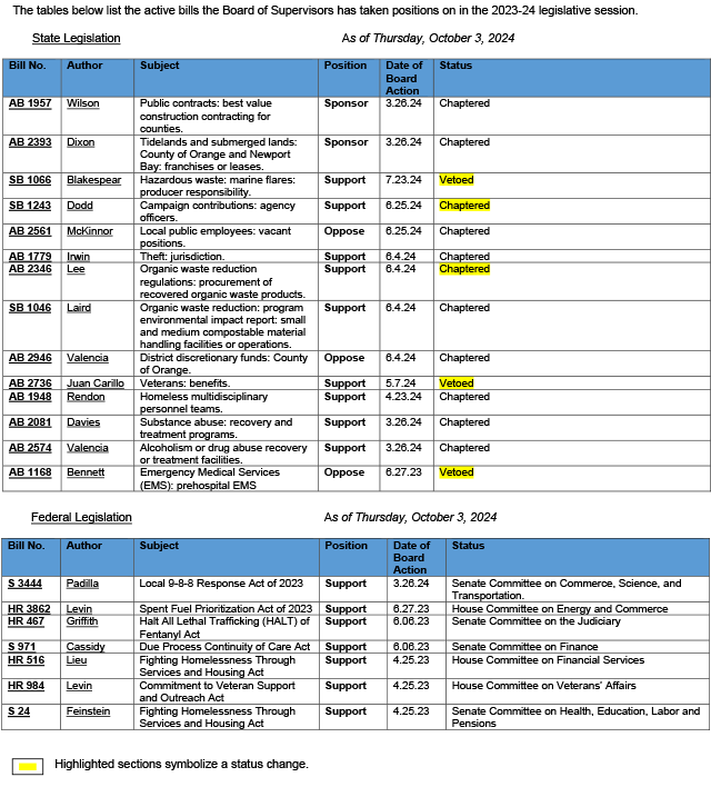 VETOED - AB 1168 (Bennett) Emergency medical services (EMS): prehospital EMS. Would overturn established case law, specifically City of Oxnard v. County of Ventura (2021), which upheld counties' authority to administer EMS. The EMS Act passed in 1980 created a two-tiered system of EMS governance through the state Emergency Medical Services Authority (EMSA) and Local Emergency Medical Services Agencies (LEMSA) to remedy what had become a fragmented/inequitable EMS system. The county, in addition to a number of other counties, is concerned that AB 1168 would open the door for any jurisdiction to attempt to overturn a similar court decision via legislation. Allowing cities that have never provided ambulance services, and do not meet the requirements to do so under the EMS Act, to dismantle county/LEMSAs’ established Exclusive Operating Areas, will jeopardize equitable EMS delivery.