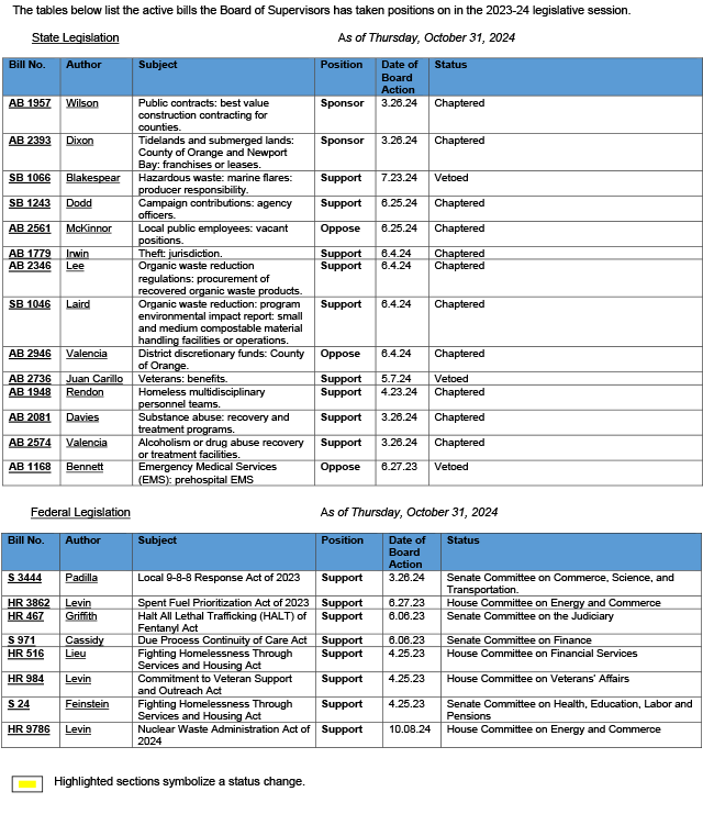 - The Orange County Board of Supervisors adopted an official support position on S.3444 on March 26, 2024.