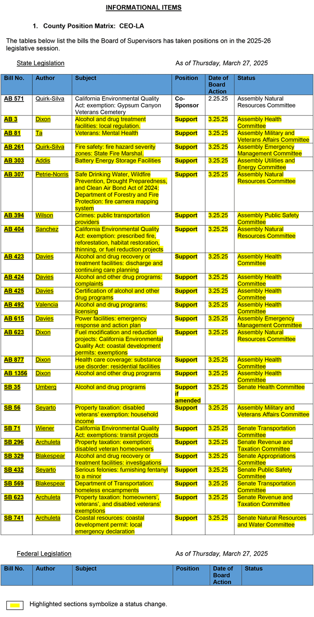 Orange County’s sponsored bill AB 571 (Quirk-Silva), which would provide a CEQA exemption for the completion of the Gypsum Canyon Veterans Cemetery, is set for hearing in the Assembly Natural Resources Committee on April 7. After it passes Natural Resources, it will then head to the Assembly Military and Veterans Affairs Committee.