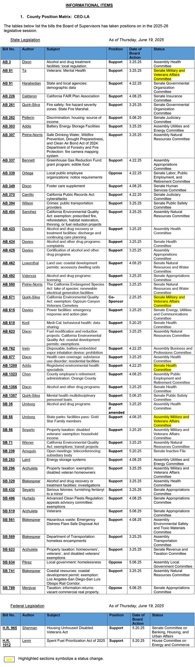 | For more information regarding County of Orange Legislative Affairs, please email at LegAffairs@ocgov.com. |