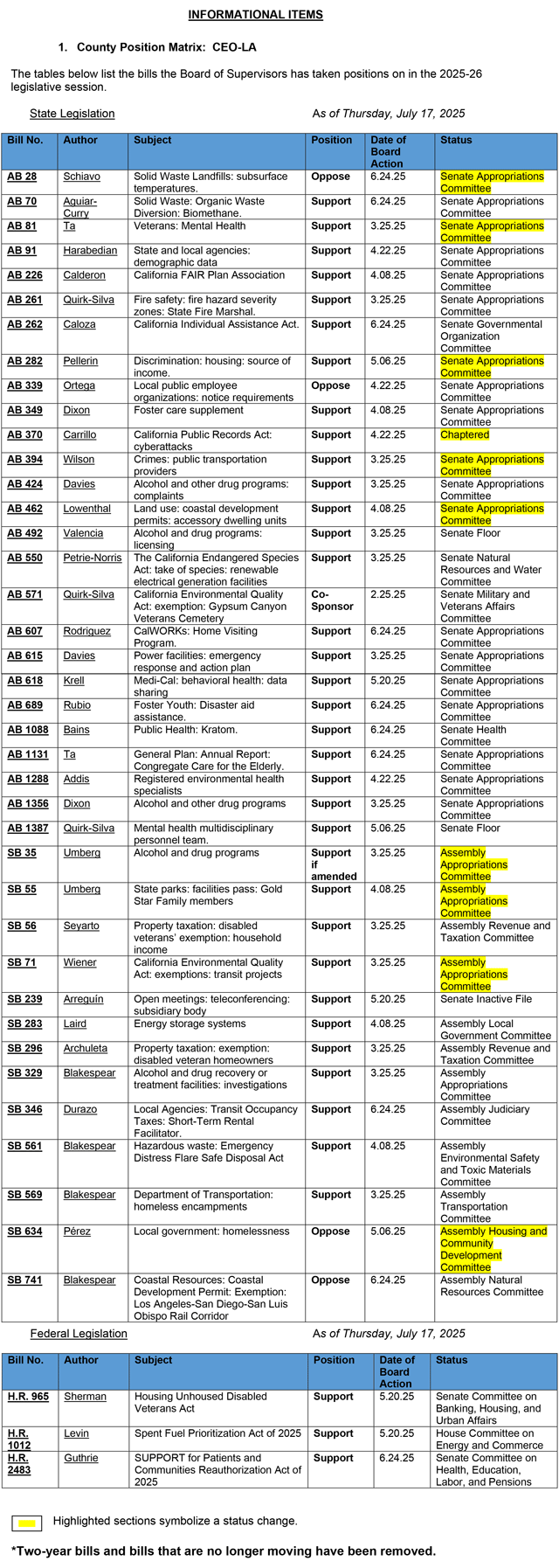 The county’s sponsored bill to exempt the proposed Gypsum Canyon Veterans Cemetery in Anaheim, Orange County from further review under the California Environmental Quality Act, AB 571, passed the Senate Military and Veterans Affairs Committee unanimously on Monday. It will be heard in the Senate Appropriation Committee on August 18.