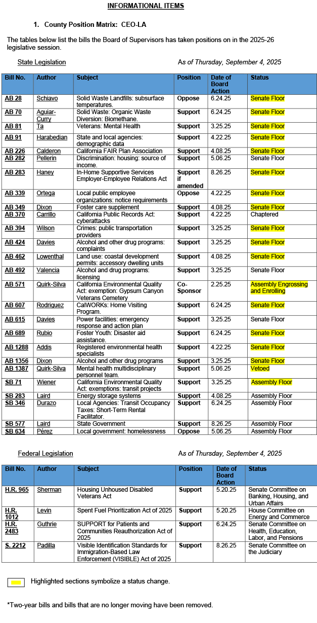 Approve recommended positions on introduced or amended legislation and/or consider other legislative subject matters - All Districts (Continued from 8/12/25, Item 45; RA #2 and #5 from 8/26/25, Item 35)