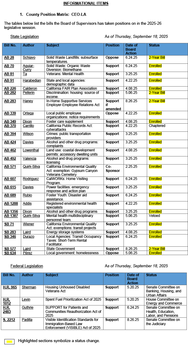 Governor Gavin Newsom now has until October 13 to complete action on the 827 bills on his desk. We anticipate that, as in prior years, a number of bills will be vetoed based on cost concerns rather than policy differences. We will keep county staff posted.