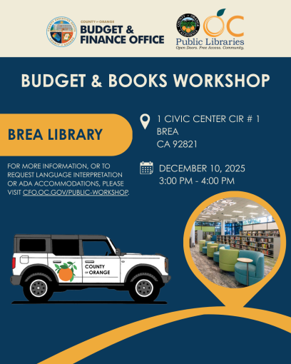 The County Executive Office’s Budget and Finance team invites you to: Budget & Books — a workshop series hosted at Orange County Public Libraries.