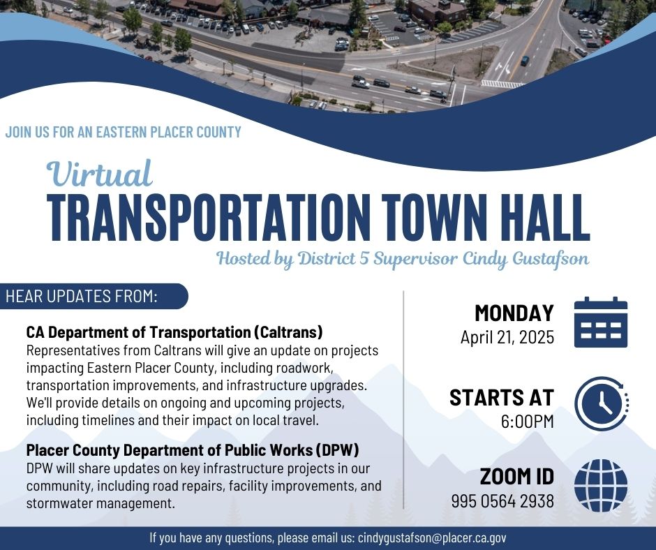 As your District 5 Supervisor, I’m committed to keeping you informed and engaged in the decisions and developments that impact our communities. I invite you to join me for a virtual town hall on May 12 at 6:00 p.m., where we’ll provide updates and take questions on transportation and infrastructure projects across western District 5, from Newcastle to Alta.