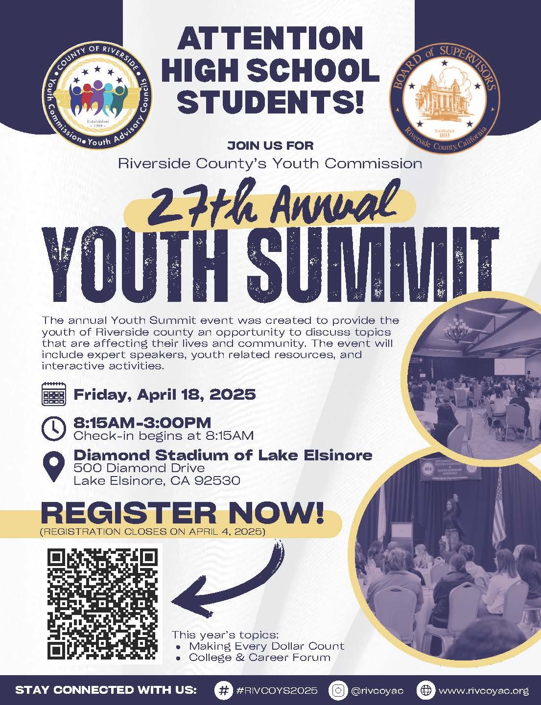 Award winners will be chosen at the discretion of each District Supervisor. The Award Presentation will be held on April 15, 2025, at the County Board of Supervisor's Meeting at 9:30 a.m. at the County Administrative Center at 4080 Lemon Street, 1st Floor Board Chambers, Riverside, CA 92501.