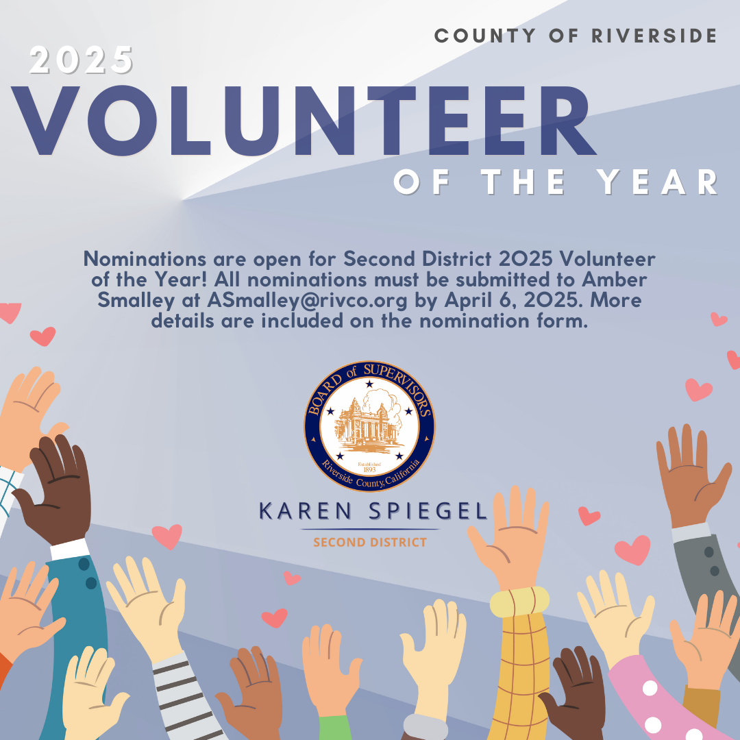 This National Volunteer Week, let's come together to celebrate and recognize the unsung heroes in Riverside County. Nominate your 2025 Volunteer of the Year and be part of a movement that cherishes the spirit of giving back.