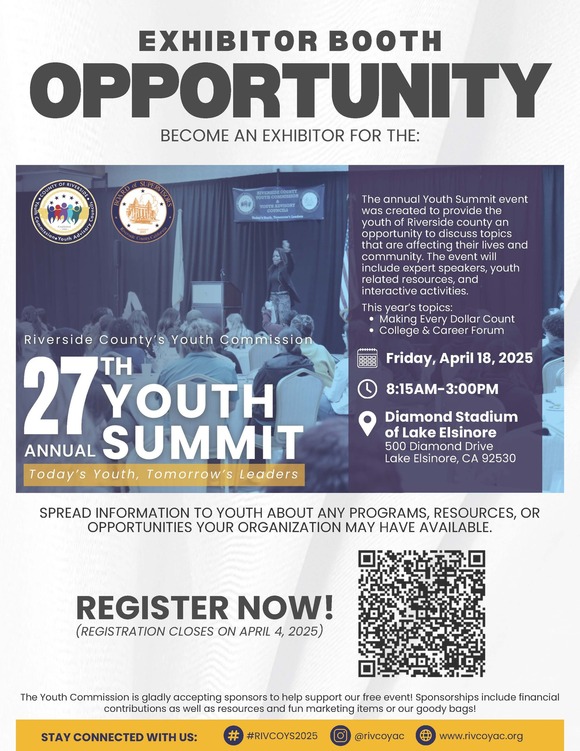 - April 1 - 9:30 a.m. at 4080 Lemon St., 1st Floor, Riverside, CA 92501. Learn more...