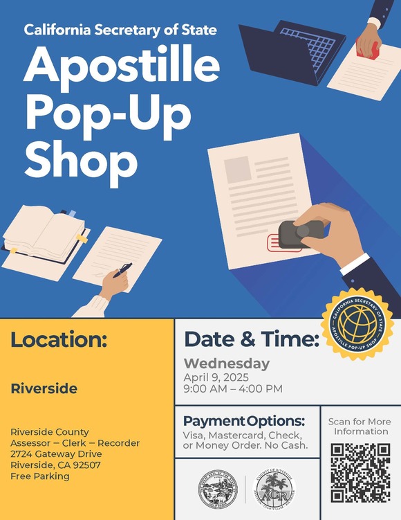 - April 8 - 9:30 a.m. at 4080 Lemon St., 1st Floor, Riverside, CA 92501. Learn more...
