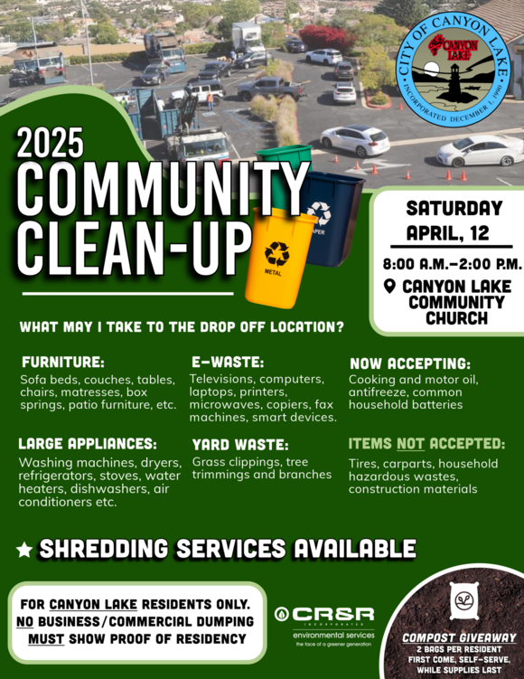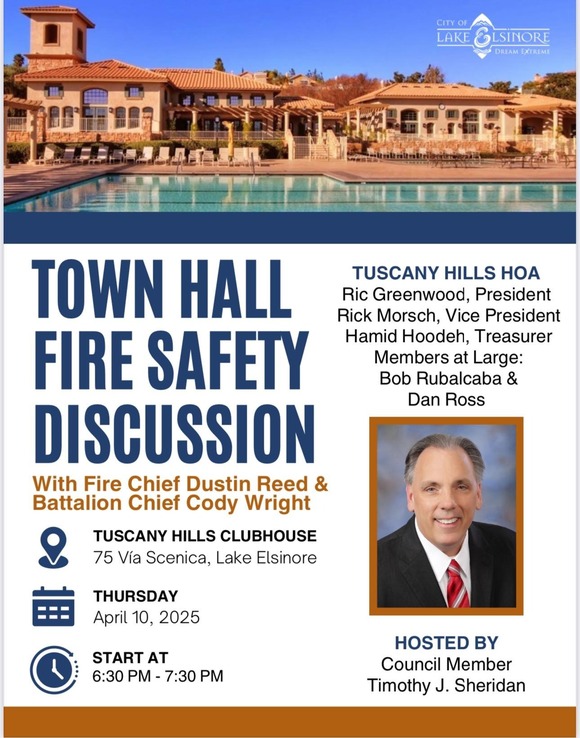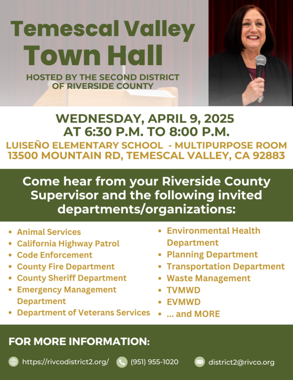 - Temescal Valley Town Hall Meeting - April 9 at 6:30 p.m. at Luiseño Elementary School Multipurpose Room at 13500 Mountain Rd., Temescal Valley, CA 92883. Learn more...