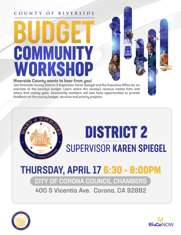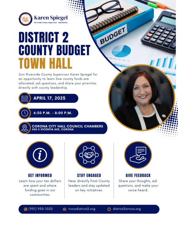 Looking ahead, I invite you to attend our upcoming District 2 County Budget Town Hall Meeting on April 17, 2025, at Corona City Hall Council Chambers (400 S. Vicentia Ave., Corona) from 6:30 p.m. to 8:00 p.m. Join me for this important opportunity to learn how county funds are allocated, ask questions, and share your priorities directly with county leadership.