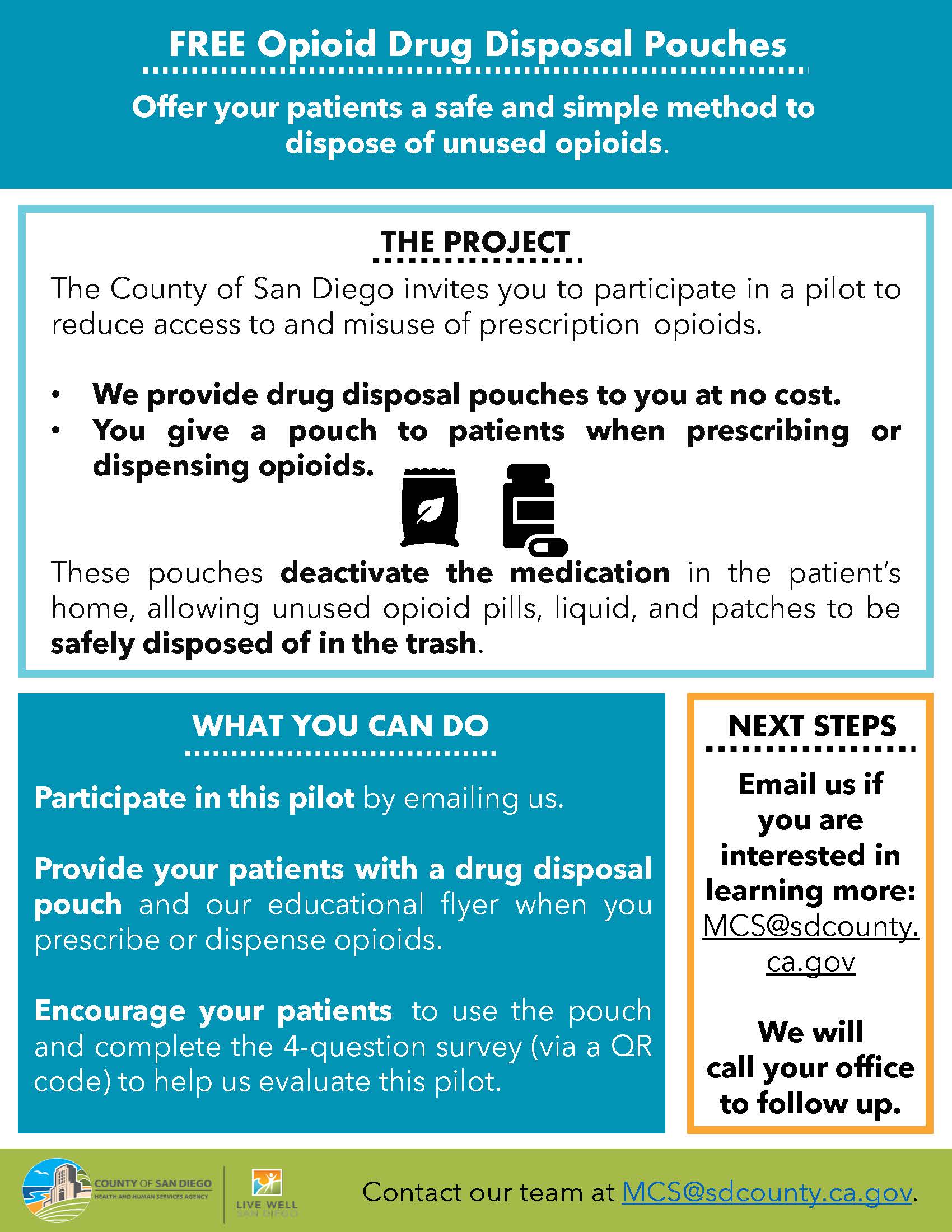 The County of San Diego invites people to participate in a pilot program to reduce access to and misuse of prescription opioids. The County will provide drug disposal pouches to participants at no cost.